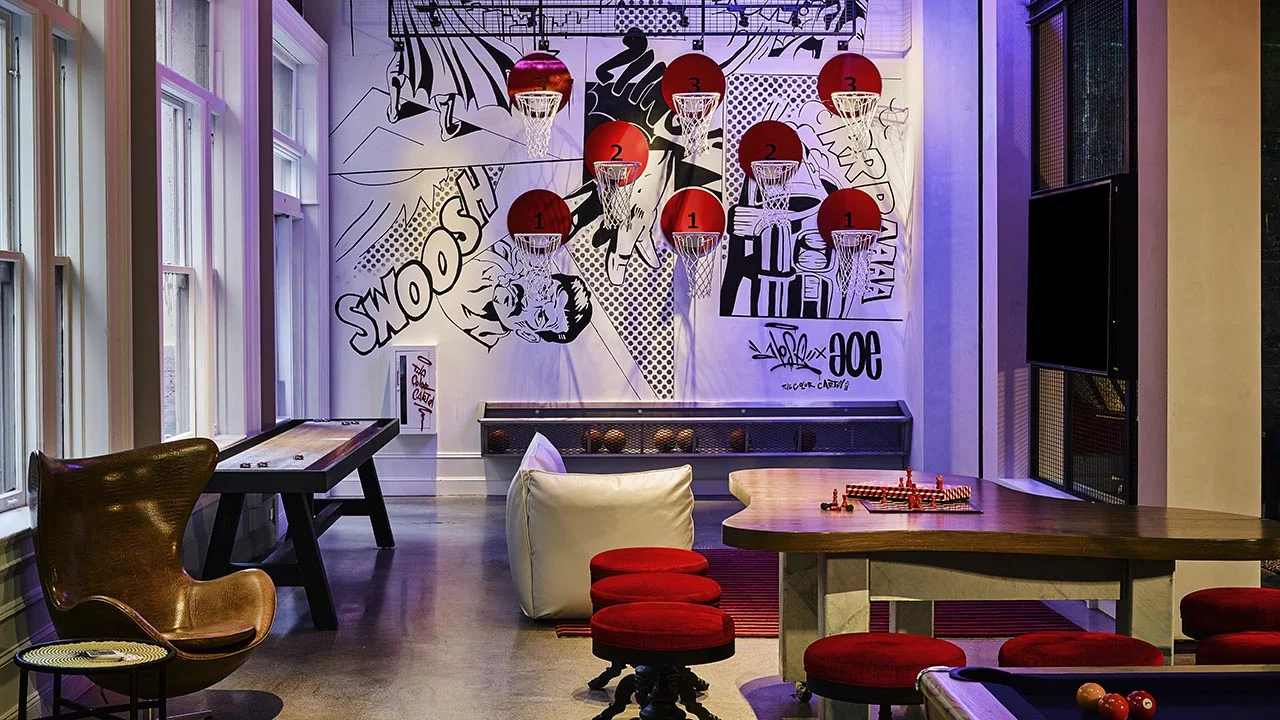 PERKS: After checking-in, I was able to head around the wall and find a chic fireplace warming the room and a bar in front of me. I mean, you guys know how much I love myself a drink or two. There were bottles of gin cascading above the bar and the detailed architecture of every possible only spurned my LOVE for this hotel. Though the hotel has a bar in around the lobby corner, there is a restaurant through the lobby next door that has a bar as well! I ordered an amazing little whiskey cocktail and it gave me life. Heading downstairs to the relaxing "game room" I was met with a ski ball machine, a shuffle board, pool table, two huge flat screen tv's to watch the football game, and A BASKETBALL WALL. Let me repeat myself. The wall had 6 hoops with points rated below them. The walls had retro batman cartoons and neon lights streaming the ceiling creating the perfect glow. I decided to play my brother best to 21 and definitely found myself sweating after. Ball is life. There is ACTUALLY something to do for everyone regardless of your age. There was the cutest group of friends laughing and cheering each other on playing ski ball. I CAN NOT WAIT to come back and stay with friends.